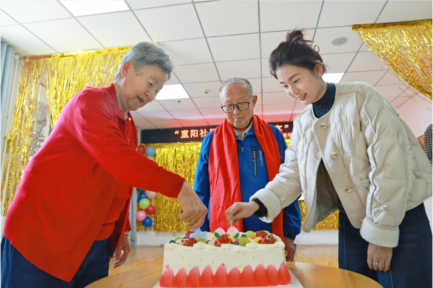 “滋味重阳,百家菜共享” 环节更是将活动氛围推向高潮。辖区居民们带着自己精心烹制的拿手菜来到现场,一道道家常美味整齐摆放在长桌上,香气四溢。随后,两位高龄老人与社区工作人员共同切开象征团圆的重阳节主题蛋糕。老人们围坐在一起,品尝着可口的菜肴与香甜的蛋糕,畅谈生活趣事,分享过往经历,欢声笑语不断,邻里情谊在美食与交流中愈发浓厚。