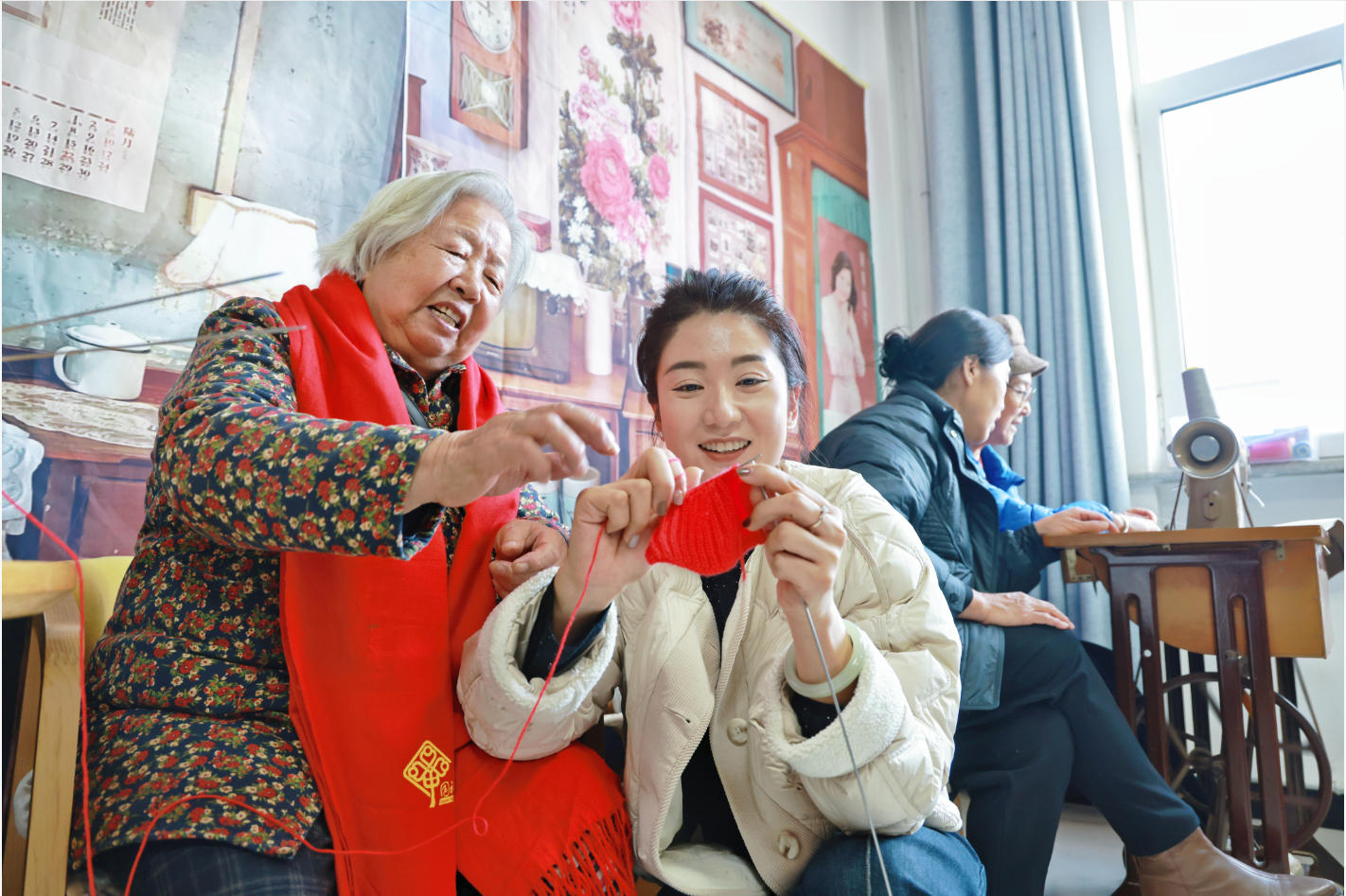 △“老师”耐心地向居民们传授编织围巾、缝制荷包的技艺