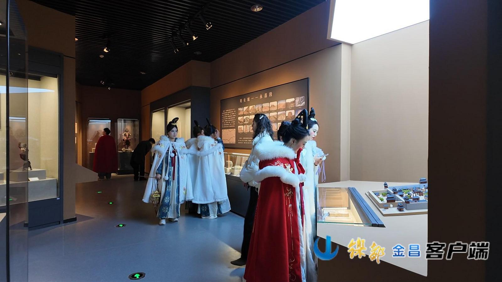 馆内,身着汉服的年轻人成为一道独特的风景,红色斗篷配白色毛领,明制马面裙摇曳生姿,她们举着手机凑近展柜,细细端详马家窑文化彩陶的纹路,认真比对明代青花人物梅瓶的细节,汉服的古典雅致与文物的历史厚重相映成趣,恰是千年文脉与当代生活的完美交融,也彰显了新馆作为文化载体,对年轻一代的吸引力,让千年文明在当代焕发新的活力。“听说新馆展出了很多永昌的‘老宝贝’,特地穿汉服来打卡,在与文物的对视中,真切感受到了家乡的历史底蕴。”一位身着明制汉服的姑娘笑着说道。